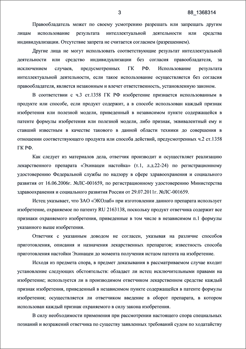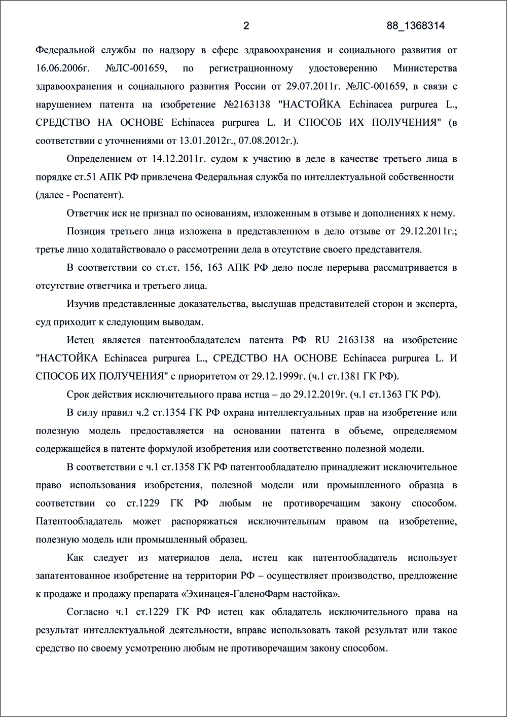 Запретить Закрытому акционерному обществу "ЭКОлаб" (ИНН 5035025076, ОГРН 1035007106958) изготовление, применение, предложение к продаже, продажу, хранение лекарственного препарата "Эхинацеи настойка" по регистрационному удостоверению Федеральной службы по надзору в сфере здравоохранения и социального развития от 16.06.2006г. №ЛС-001659, по регистрационному удостоверению Министерства здравоохранения и социального развития России от 29.07.2011г. №ЛС-001659, в связи с нарушением патента на изобретение №2163138 "НАСТОЙКА Echinacea purpurea L., СРЕДСТВО НА ОСНОВЕ Echinacea purpurea L. И СПОСОБ ИХ ПОЛУЧЕНИЯ".