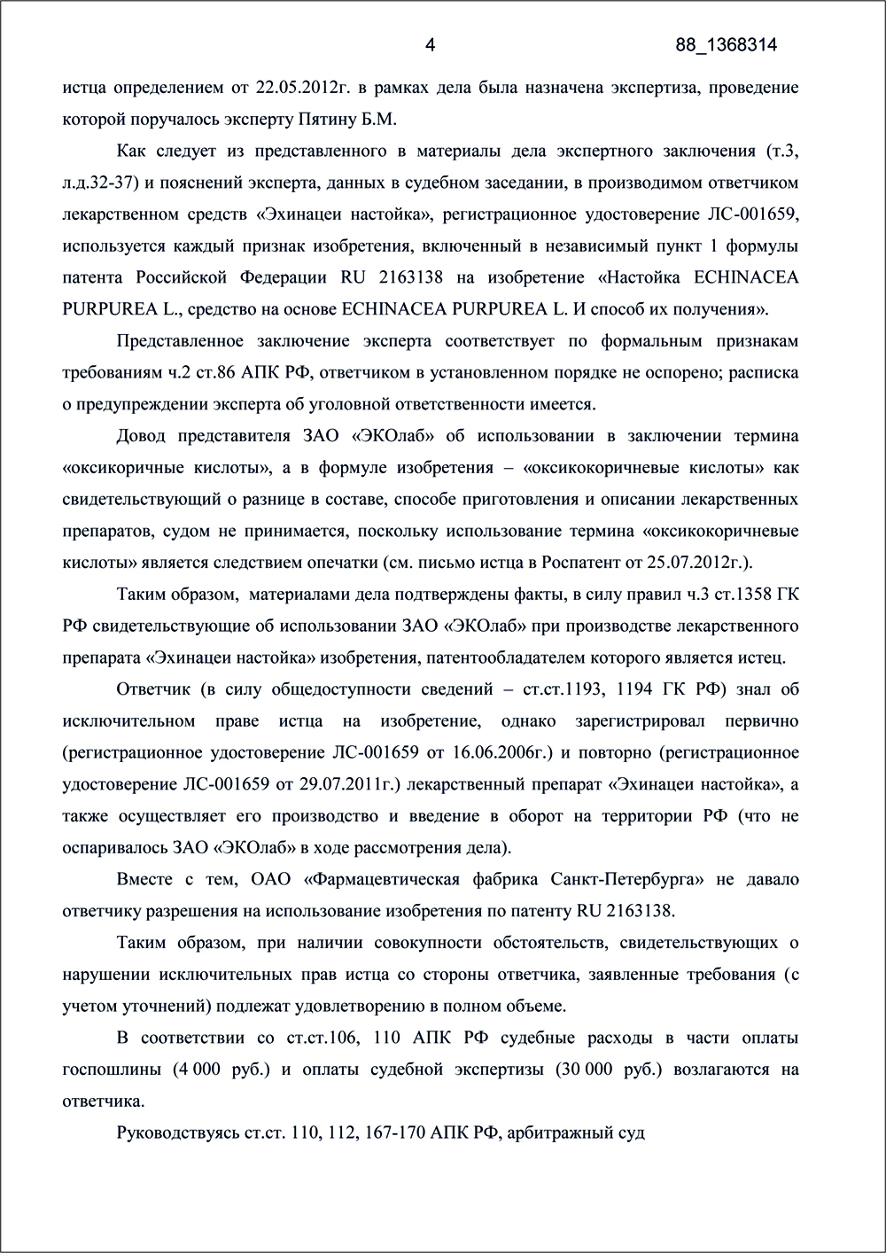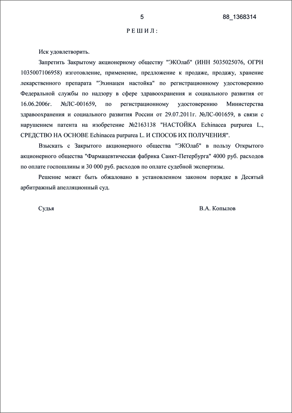 07 августа 2012г. Арбитражный суд Московской области вынес решение по иску Открытого акционерного общества «Фармацевтическая фабрика Санкт-Петербурга» к Закрытому акционерному обществу «ЭКОлаб» о прекращении нарушения патента на изобретение №2163138 "НАСТОЙКА Echinacea purpurea L., СРЕДСТВО НА ОСНОВЕ Echinacea purpurea L. И СПОСОБ ИХ ПОЛУЧЕНИЯ" (в соответствии с уточнениями от 13.01.2012г., 07.08.2012г.).