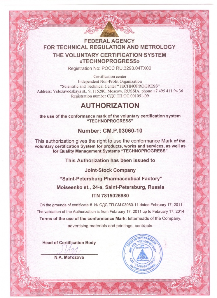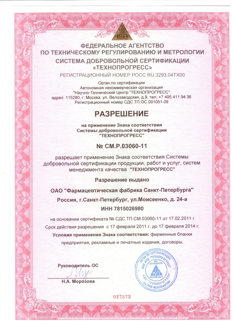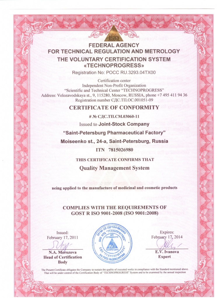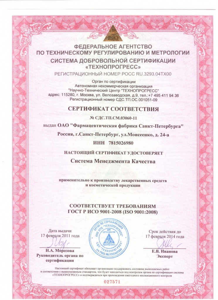 ОАО «Фармацевтическая Фабрика Санкт-Петербурга» получила сертификат соответствия системы менеджмента качества требованиям ИСО-9001, а также разрешение на применение Знака соответствия Системы добровольной сертификации «ТЕХНОПРОГРЕСС».